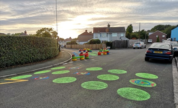 In September 2019, following a co-design process involving students, parents and local residents at St Davis’s R C Primary School in Newport, Sustrans trialled a number of interventions using colourful, planted water filled modules (Street Kit) and chalk. Workshops with the school and local residents had identified that congestion at school drop off and pick up times had resulted in a number of specific issues including; parents and children being forced onto narrow pavements and lack of crossings.