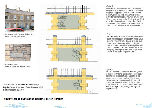 (Above) Photograph shows the design stage of the project. It was identified that the brickwork on Pugsley street was a feature that could be replicated in the flood defence design. Second photograph shows the completed wall prior to landscaping.