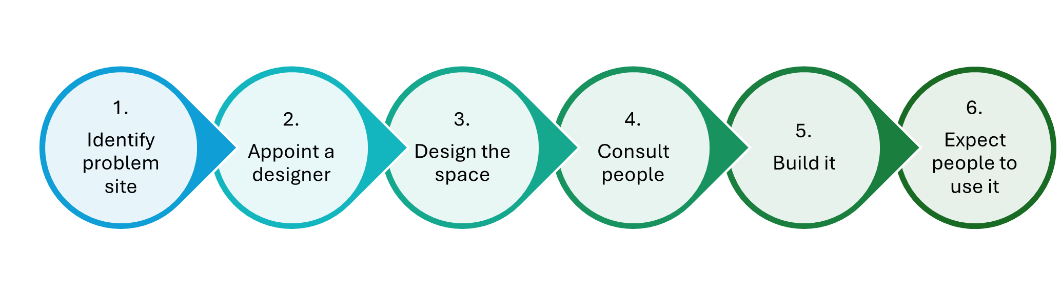 An example of what a shift to a placemaking approach looks like might be in tackling a “problem” space within a neighbourhood. One approach to such a space would be the following:
