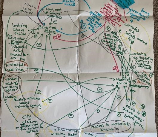 As part of the workshops, building a series of system maps helped us to collectively develop our understanding of the reality of the challenge. To do this we:
